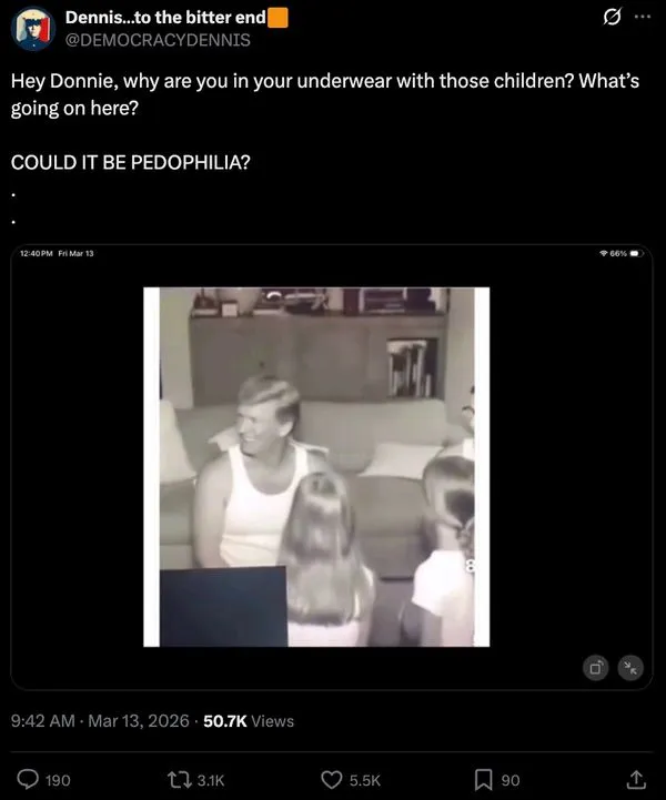on March 13, an X user shared (archived) the picture with the caption, “Hey Donnie, why are you in your underwear with those children? What’s going on here? COULD IT BE PEDOPHILIA?” Other users alleged the image appeared in a federal case file pertaining to the late sex offender Jeffrey Epstein.
